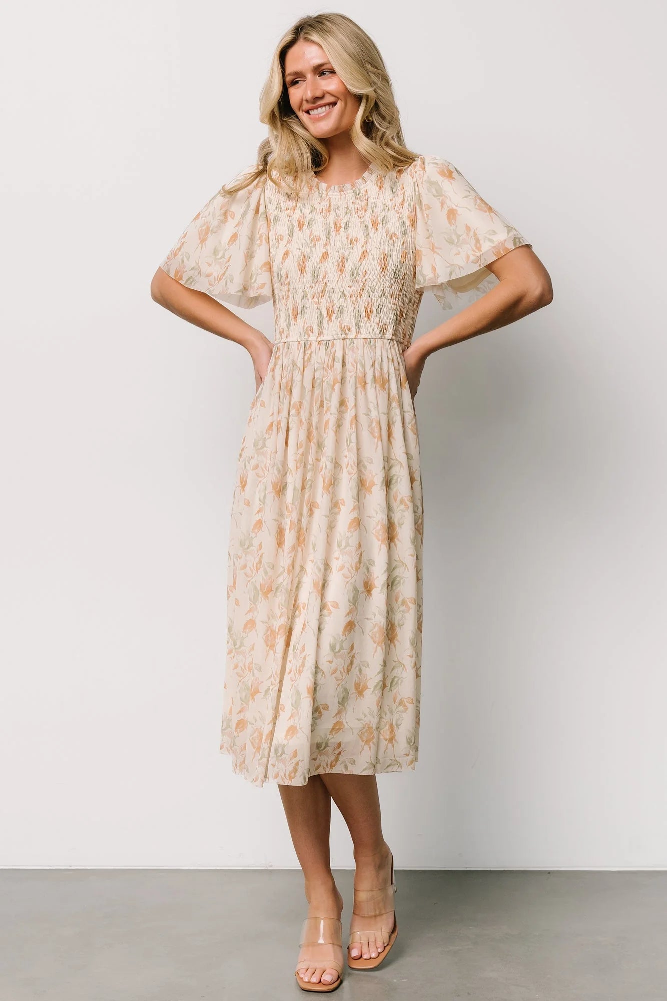 Bailey Smocked Midi Dress | Ivory + Golden Floral