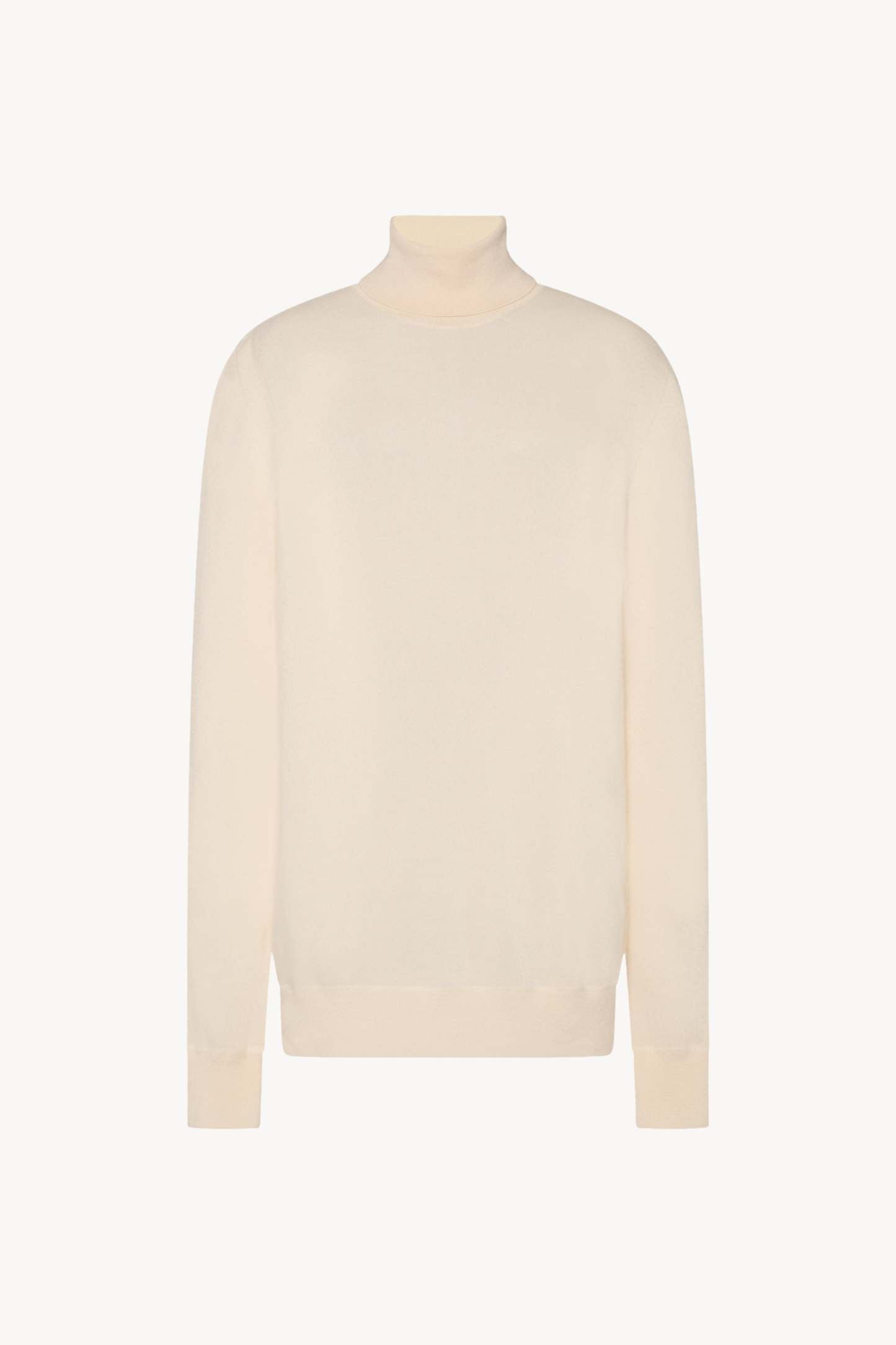 Relaxed long-sleeved top in ultrafine cashmere jersey with high, folded turtleneck, seamless construction, and ribbed neckline, cuffs, and hem.