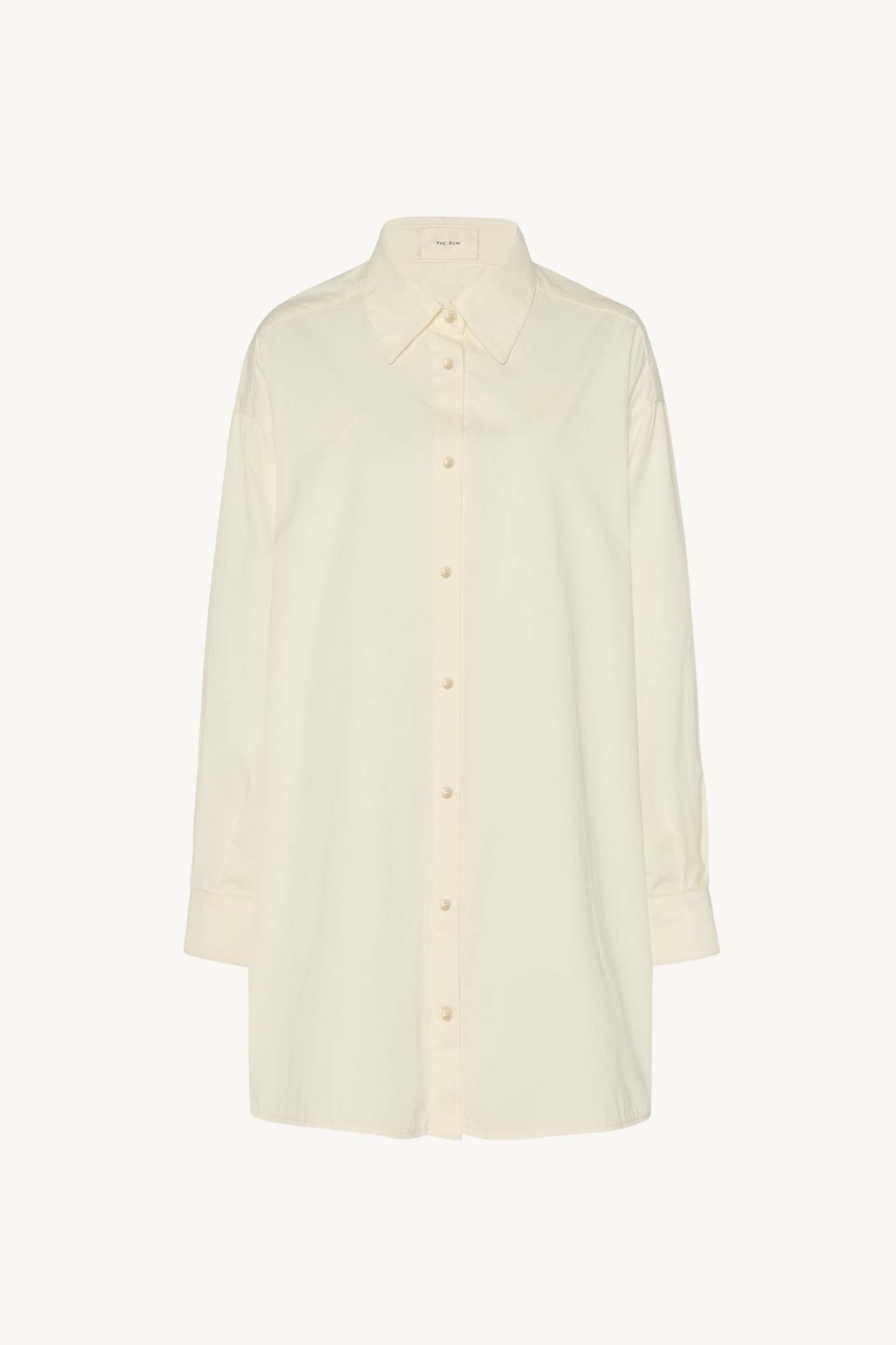 Oversized button-up shirt in cotton and cashmere gabardine with straight hem and exposed front placket with mother-of-pearl buttons.
