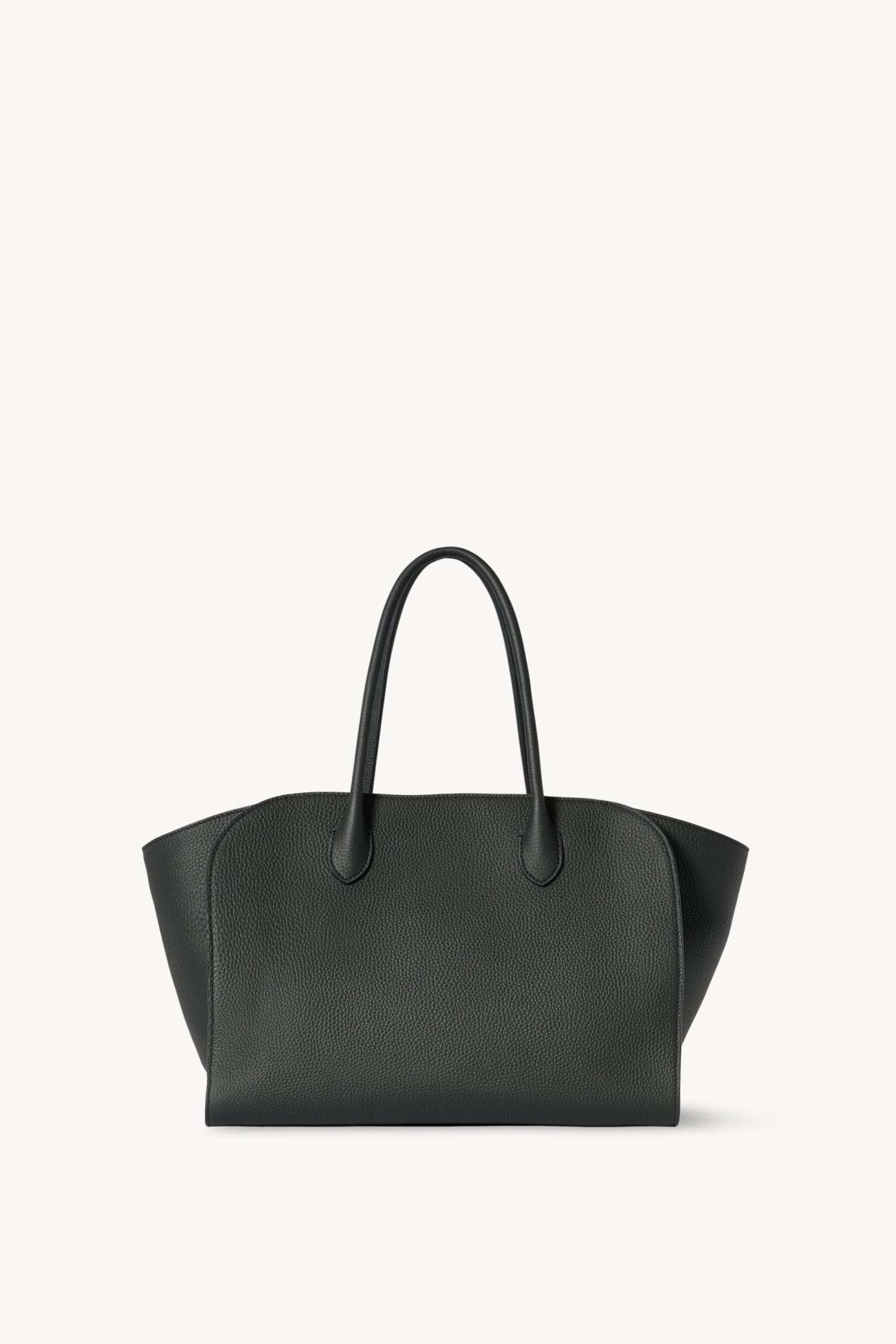 Softly structured tote bag in matte grained calfskin leather with tubular handles, gusseted side panels, and top zipper closure.
