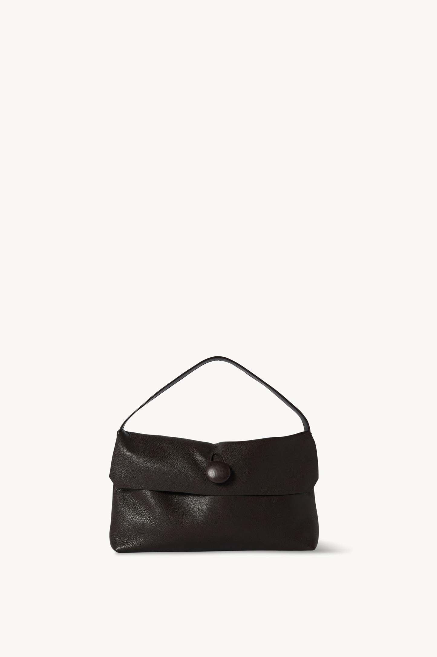 Compact top handle bag in finely grained calfskin leather with single flat handle and flap closure secured by a leather-covered button. Unlined and with no visible stitching, it retains a soft and delicate feel. Characterized by a buttery-soft hand and subtle sheen, the leather offers a supple texture and refined finish.