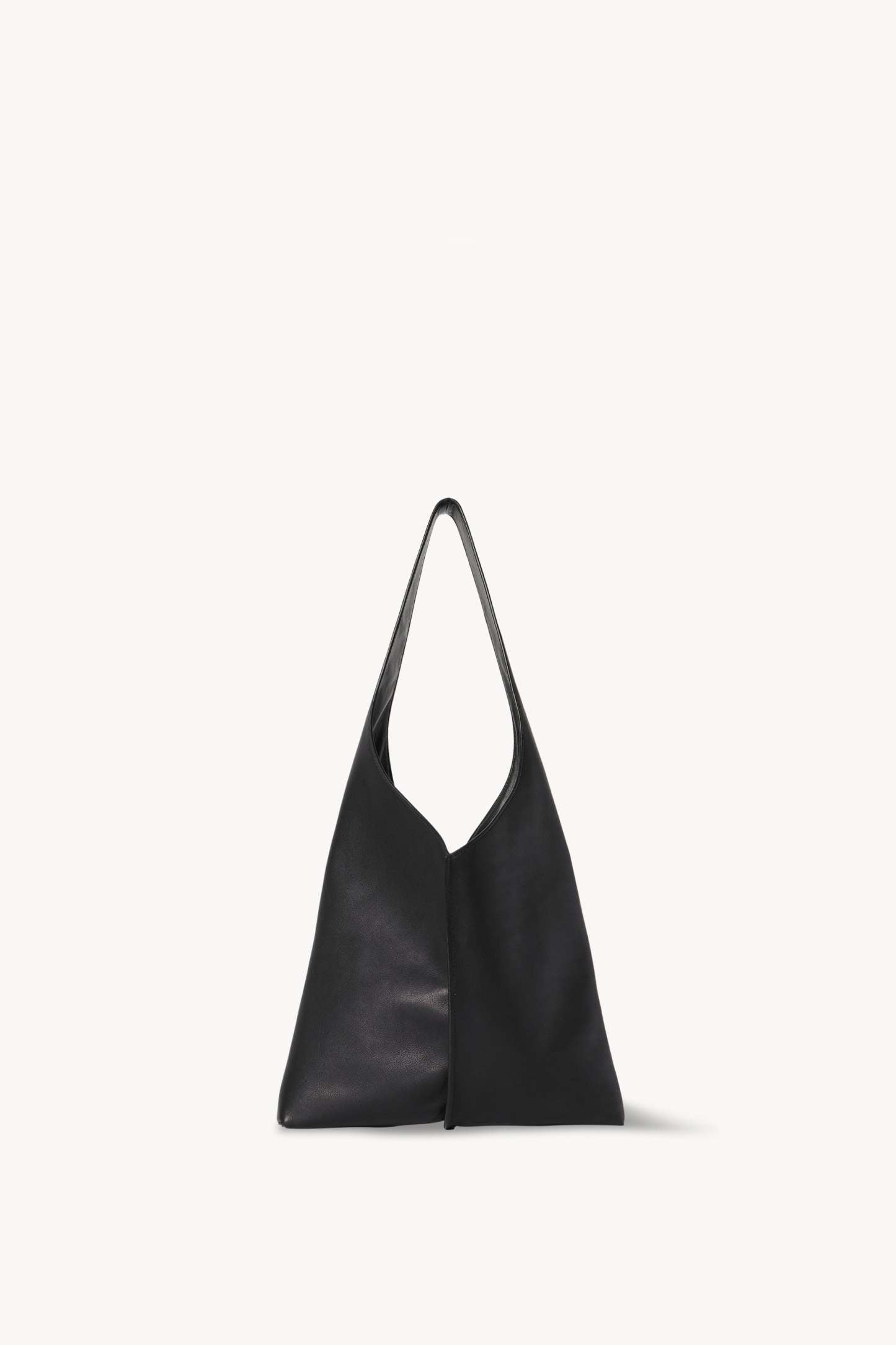 Unstructured handbag in polished saddle leather with draped handle, center seam detail, and detachable zipper pouch.