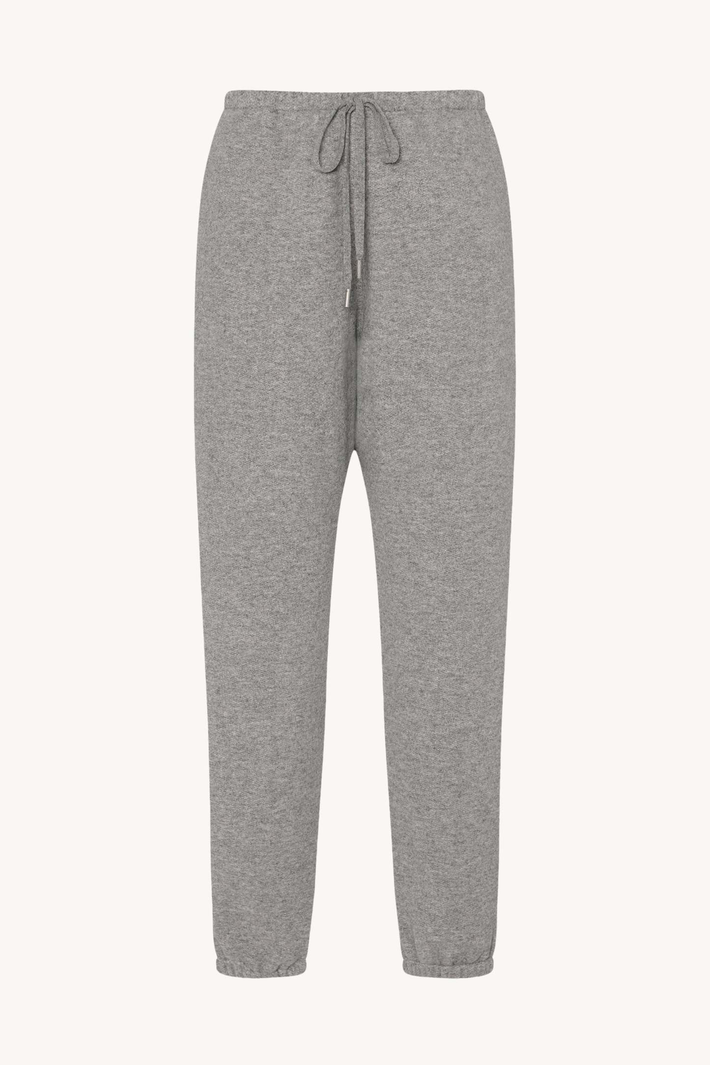 Mid-rise pant in cashmere and cotton French terry with slightly tapered leg, drawstring waist, and side seam pockets.